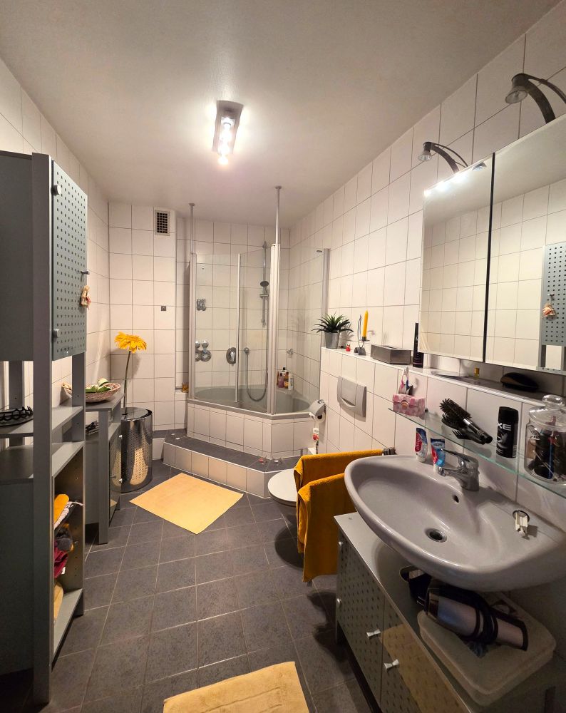 Das Badezimmer ist modern und zeitlos gestaltet. Die übergroße Eckdusche mit Kunststofffronten rundet diesen Raum ab.