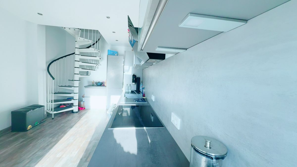Eine stilvolle interne Treppe in der modernen Küche verbindet beide Ebenen und