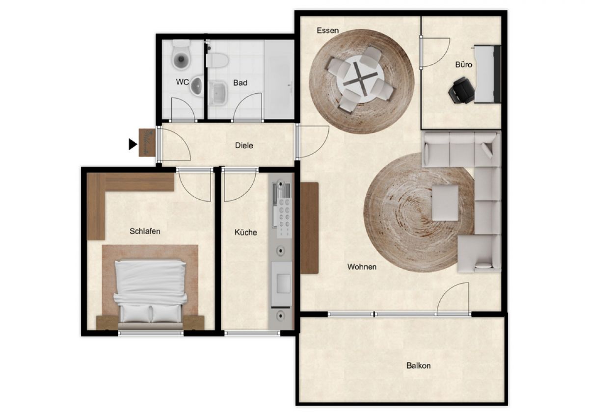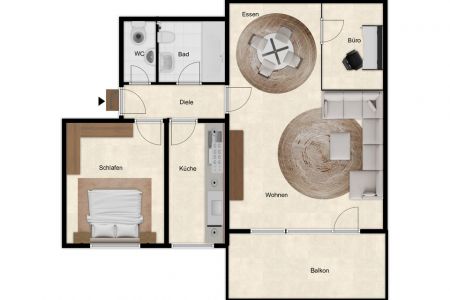 Die Wohnung bietet mit ca. 68 m² ein Schlafzimmer, sowie eine moderne Küche mit zeitloser Einbauküche. Ein separates Gäste-WC sorgt für zusätzlichen Komfort. Das Badezimmer ist in klassischem Weiß gehalten und mit einer Badewanne ausgestattet. Helle, zeitlose Fliesen verleihen allen Wohnräumen ein freundliches und modernes Erscheinungsbild. Ein eigener Kellerraum bietet zusätzlichen Stauraum.