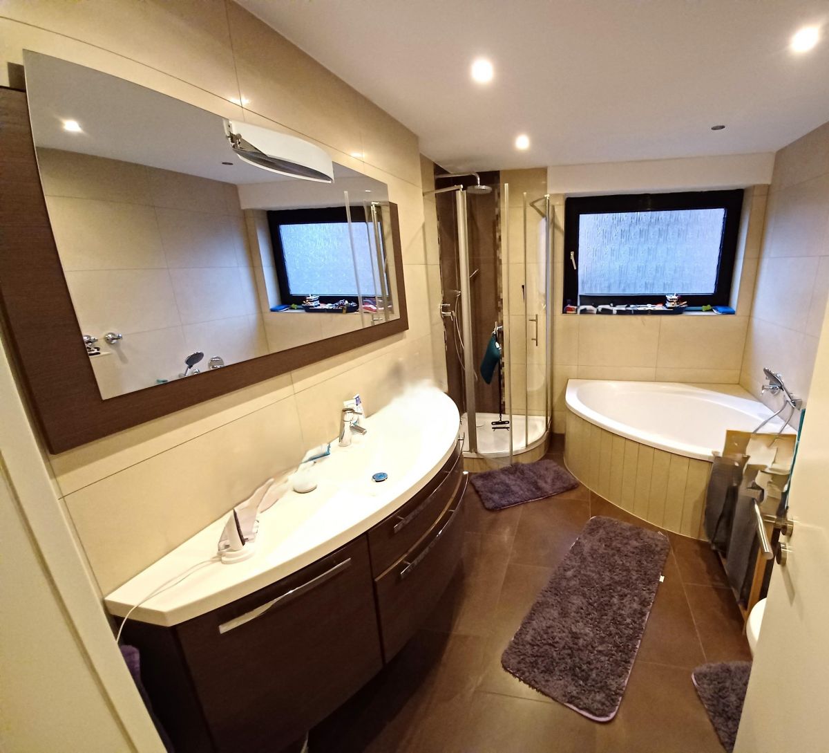 mit hochwertigen hellen Fliesen ausgestattet, die für ein modernes, elegantes Erscheinungsbild sowie ein großzügiges Raumgefühl sorgen.