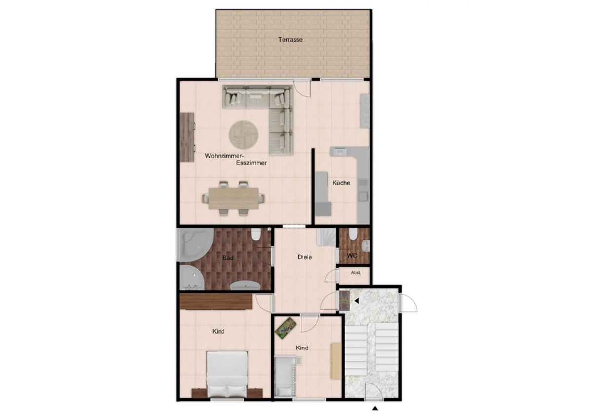 Ein besonderes Highlight ist der eigene Garten in Kombination mit einer großzügigen Terrasse, die zum Entspannen und Verweilen einlädt.