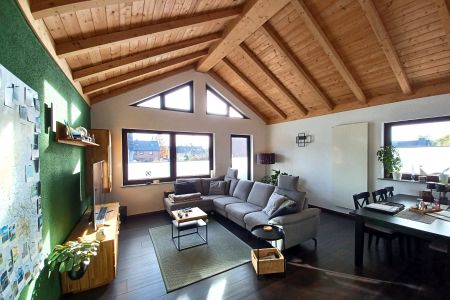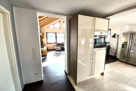 Diese Immobilie besticht durch ihre lichtdurchflutete, offene Wohngestaltung. Das großzügige Wohnzimmer mit seinem offenen Giebel und der beeindruckenden Fensterfront schafft ein Gefühl von Weite und Freiheit. Der Zugang zum sonnigen Balkon lädt dazu ein, den Tag bei einem Kaffee zu beginnen oder laue Sommerabende entspannt ausklingen zu lassen.
