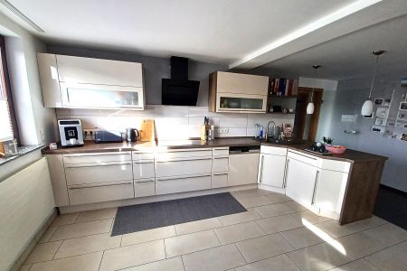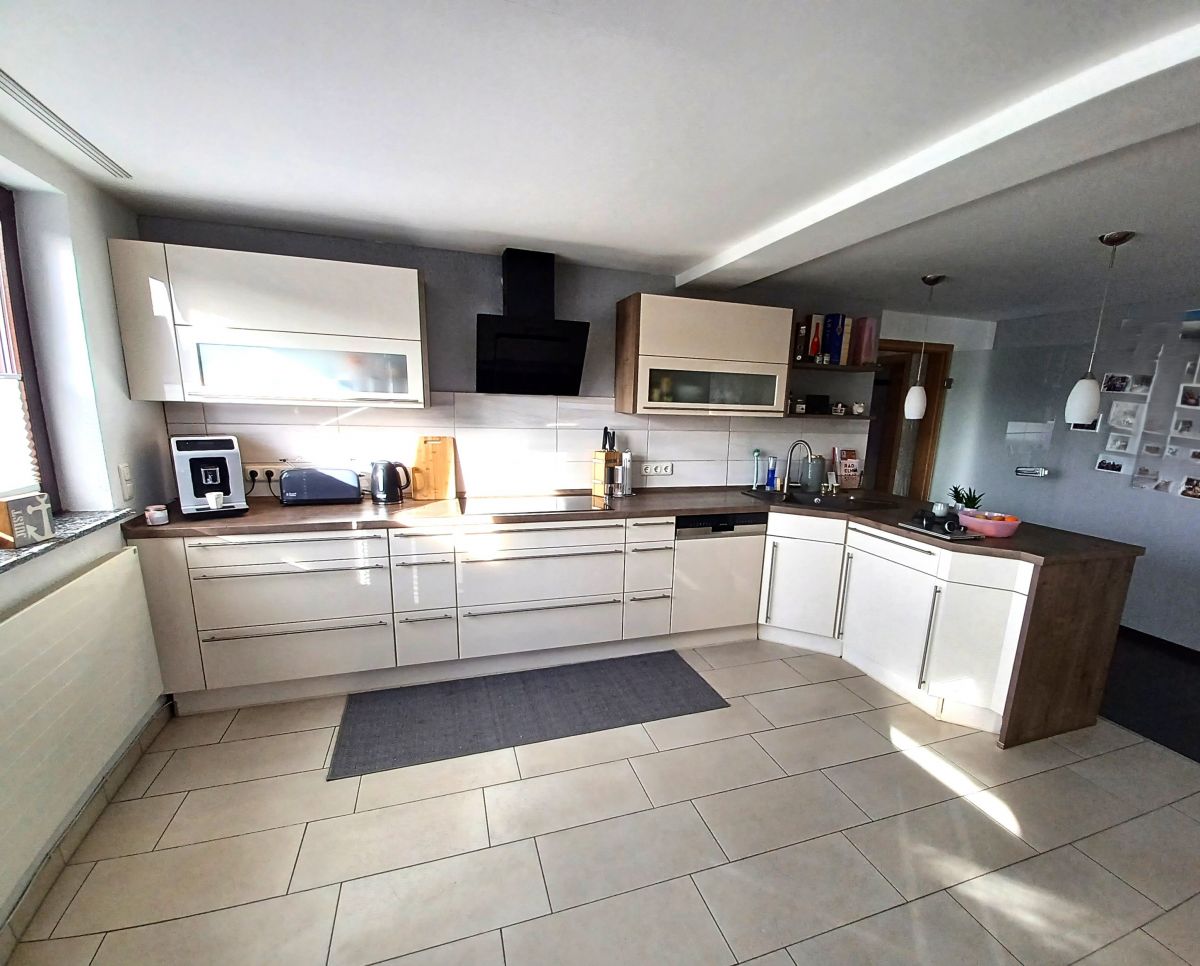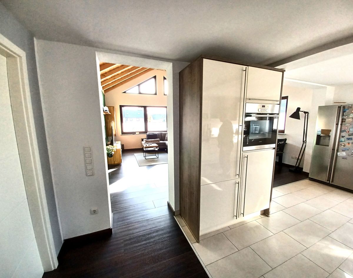 Angrenzend an den offenen Wohn- und Essbereich befindet sich die außergewöhnlich großzügige Küche. Ihr warmer Beigeton verleiht dem Raum eine behagliche Atmosphäre und sorgt für ein harmonisches Gesamtbild. Sie ist mit eleganten Hochglanzfronten ausgestattet, verfügt über sämtliche moderne Einbaugeräten und ist im Kaufpreis enthalten.