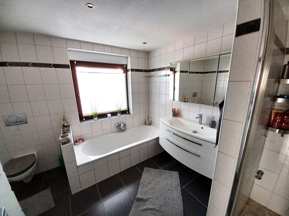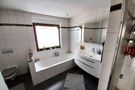 Ein großes Badezimmer im aktuellen Design mit einer begehbaren Dusche und einer Badewanne machen das Wohlfühlpaket komplett.
