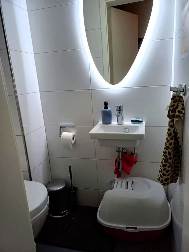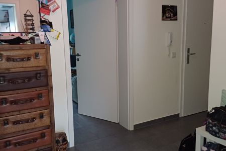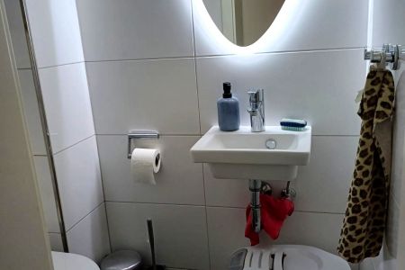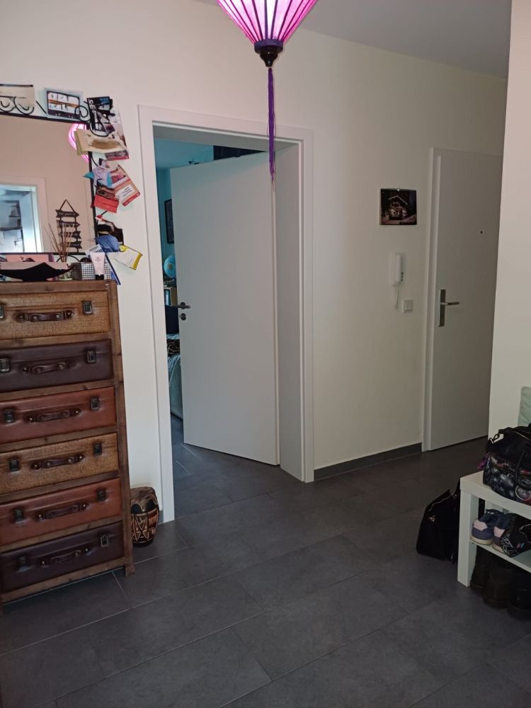 Die Wohnung ist mit einer Fußbodenheizung versehen und wurde mit großen grauen Fliesen modernisiert.