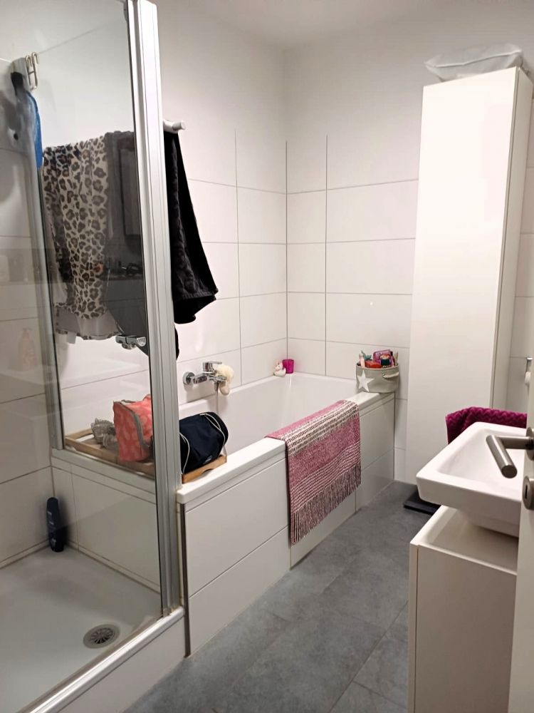 Bad, welches über eine Dusche + Badewanne verfügt und ebenso wie das Gäste-WC neu gefliest wurde. Abschließend finden Sie das Schlafzimmer. Auch hier gibt es ausreichend Platz zur freien Gestaltung.