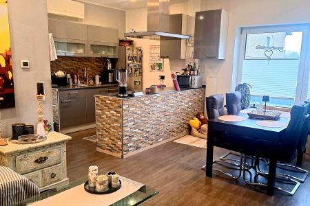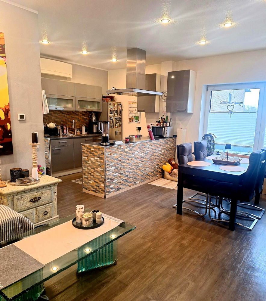Der offene Wohn- und Essbereich mit moderner Küche bildet das Herzstück der Wohnung. Von hier haben Sie direkten Zugang zur überdachten Terrasse und dem angrenzenden privaten Garten. Perfekt für entspannte Stunden im Freien.